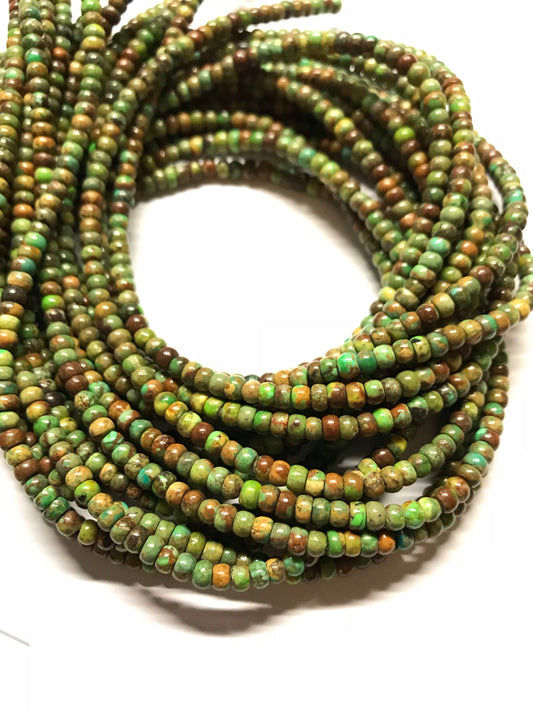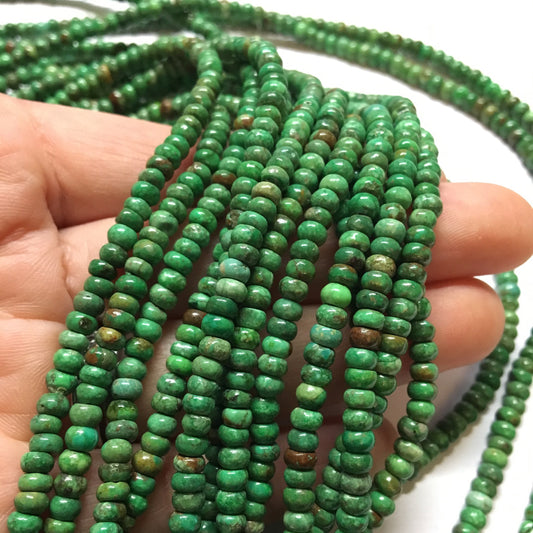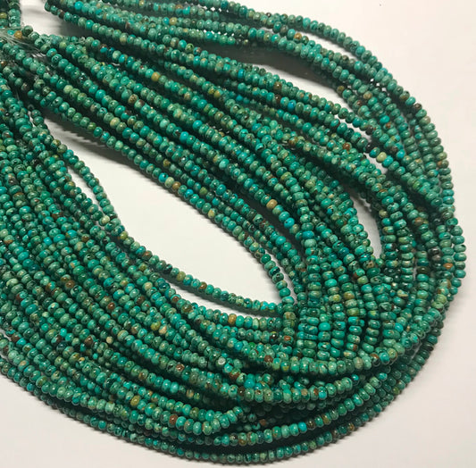 4mm Chinese green rondelles, Mojave green turquoise from Anhui, 16 inch strand.